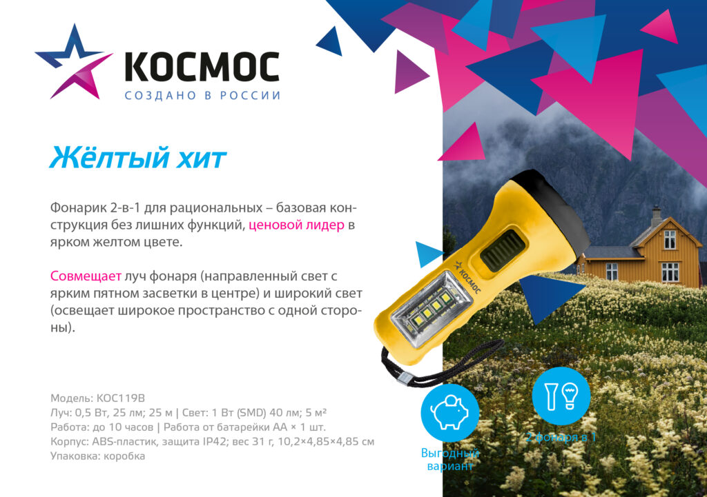 Космос представляет модель фонаря KOC119B — практичное и доступное решение для повседневного использования. Модель ориентирована на широкий круг пользователей, которым важно надежное освещение без переплаты за избыточные функции. Благодаря продуманной конструкции, удобному формату и функциональности 2‑в‑1 фонарь сочетает в себе простоту эксплуатации, практичность и экономичность.
