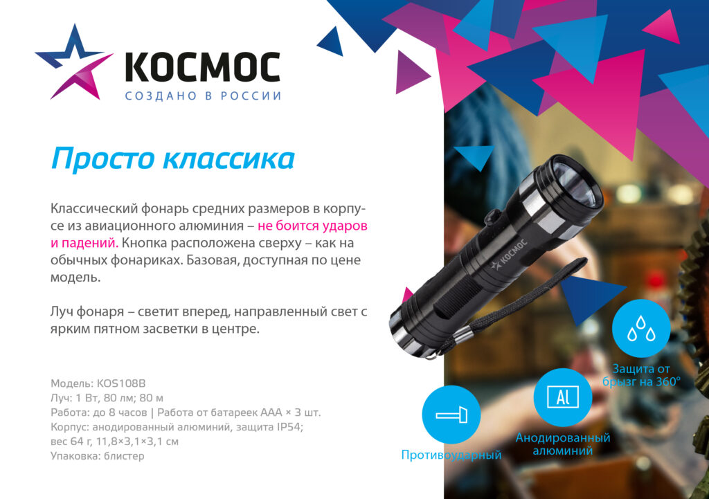 Такая комбинация мощности и компактности делает KOS108B универсальным помощником при ремонте дома, прогулках в тёмное время суток, туристических вылазках и повседневных задачах.